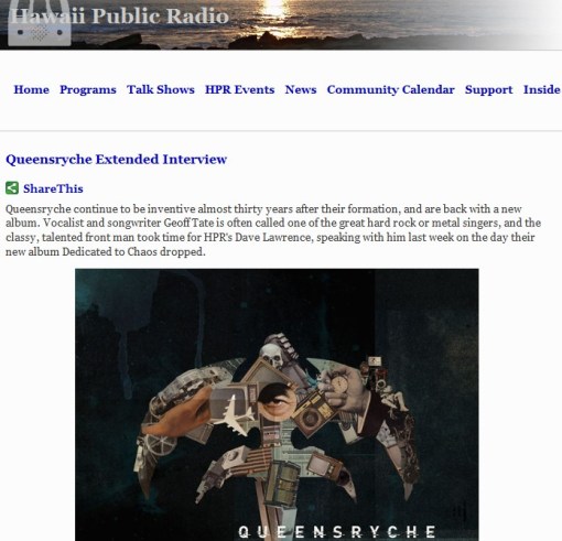 Last week on Tuesday the new Queensryche album Dedicated to Chaos dropped, and I was fortunate to speak with singer Geoff Tate. This new interview covers a lot of different topics, and Geoff, if you’re unfamiliar, is a truly articulate, thoughtful guy to speak with. Some of the material discussed includes the new Dedicated to Chaos album, the future of records and touring, the fading record company/publishing/intellectual property commercial model, the late Ronnie James Dio’s importance to both Queensryche and Geoff, experiences here in Hawaii, first hand accounts of being in Iraq to perform for the troops and reflections on their epic, and emotional American Soldier album, Geoff’s passion for wine and winemaking, and much more. It was a pleasure to reconnect with a gentleman whose appearance in 2007 on my afternoon show was a real treat.