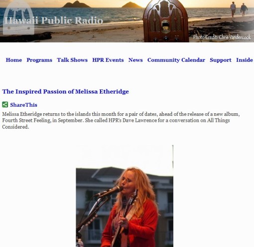 At my page on the HPR site, you can also see four videos, including a breathtaking performance of Like The Way I Do that’s over ten minutes and one of the best-captured live versions of that song… Also check out Melissa paying tribute to Janis Joplin solo acoustic, showcasing her skills in jaw-dropping fashion… See her live in action from just days ago ‘down under’ on her current tour, playing an acoustic version of Falling Up, a song from Fourth Street Feeling, her new album due in September.